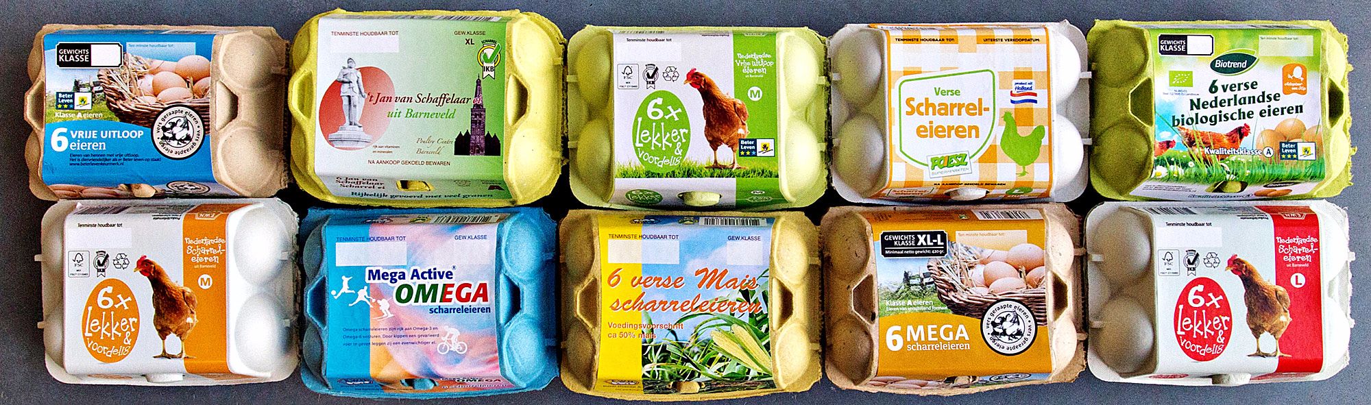 Eieren worden onderverdeeld naar huisvesting van de kip: verrijkte kooi-, scharrel-, vrije uitloop- en biologische eieren. Van elke soort zijn er witte en bruine eieren.